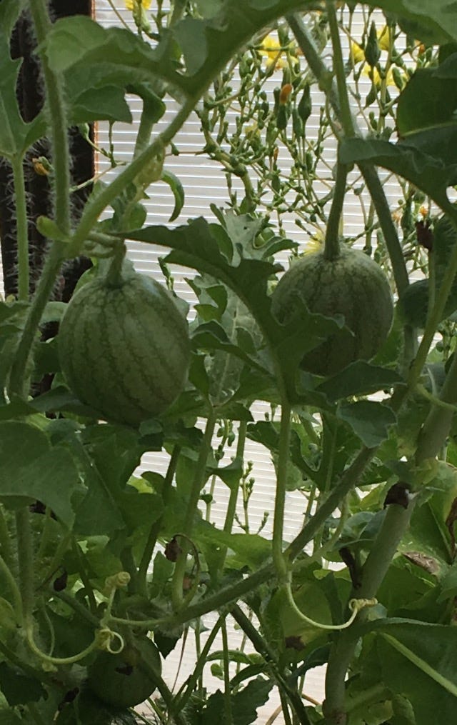 The watermelons he is growing in the greenhouse he built, and a media cabinet, recently completed, made of Walnut and Karelian Birch.