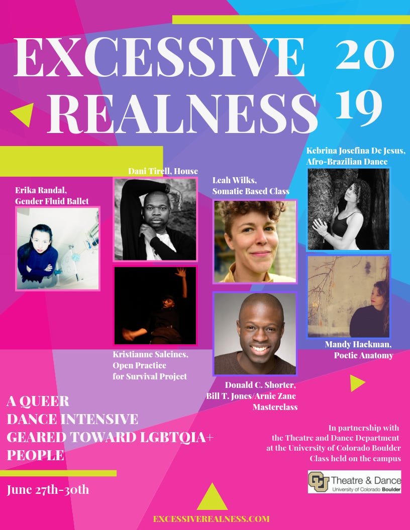 Excessive Realness is a four-day dance intensive spanning Thursday June 27th to Sunday June 30th, 2019. This year, it will take place in Boulder, Colorado in partnership with The Department of Theatre & Dance at the University of Colorado Boulder. There will be four classes on Thursday, Friday, Saturday, and Sunday (9:00-9:50am, 10:00-11:30am, 12:00-1:30pm, lunch from 1:30-2:30pm, and 2:30-4pm). The intensive consists of exciting and unique dance classes from the lens of queer artists and educators: